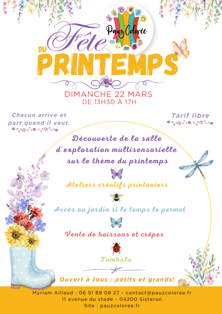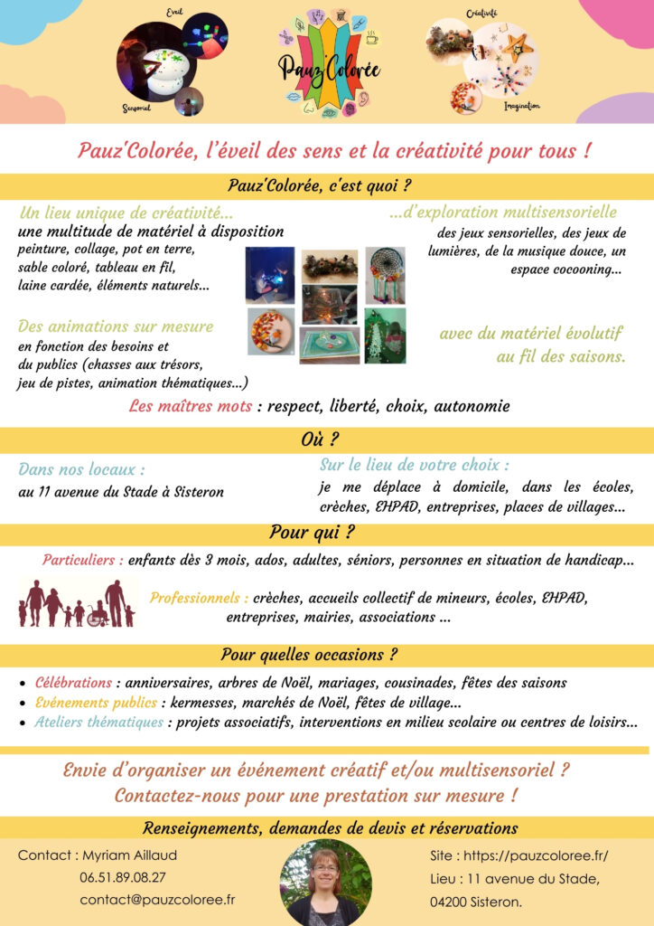 Pour le sensoriel et le créatif, Pauz’Colorée est là ! J’ouvre à la demande ! Alors n’hésitez pas à m’appeler et on fixera ensemble un horaire qui vous convient ! 0651890827